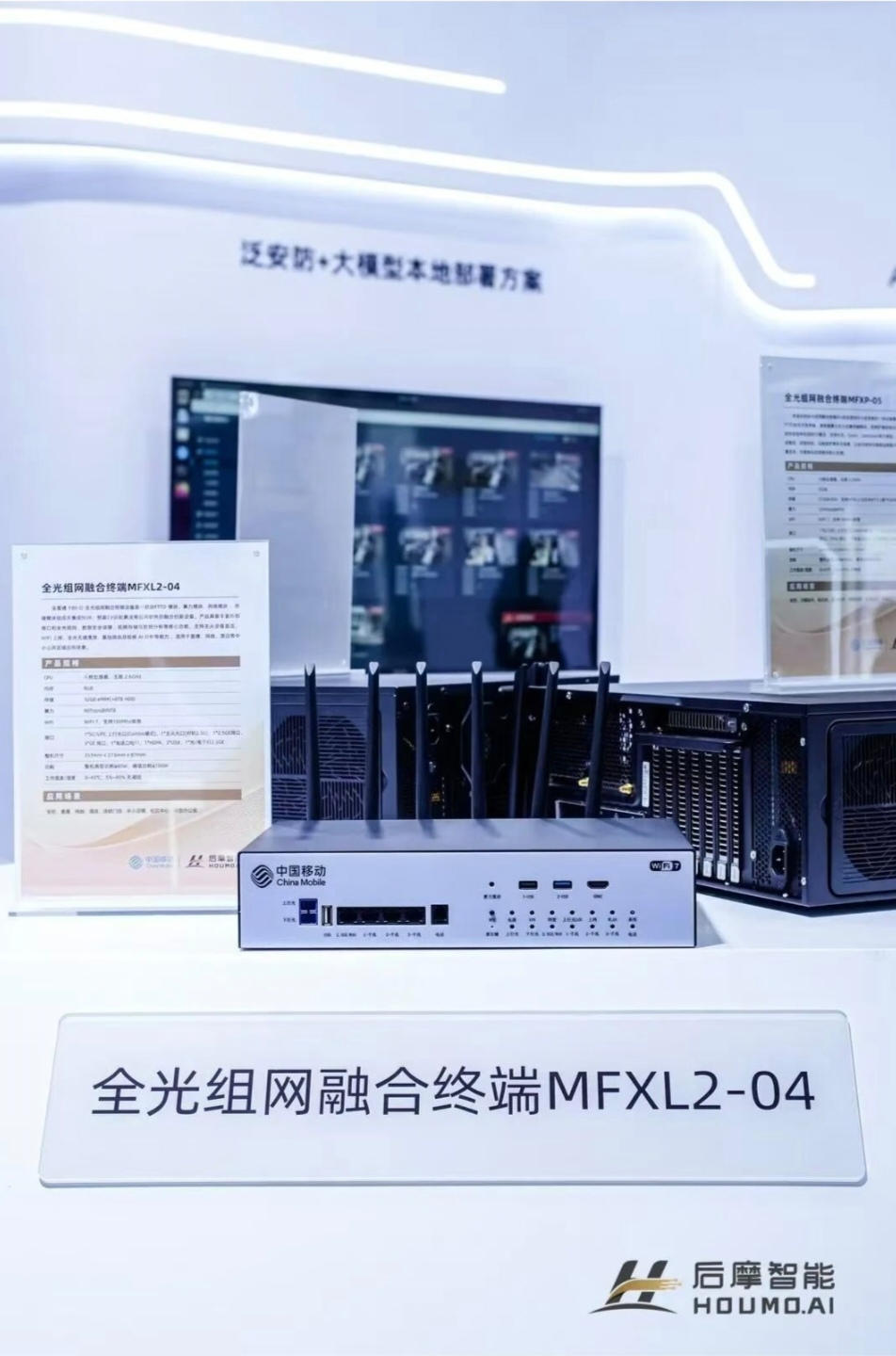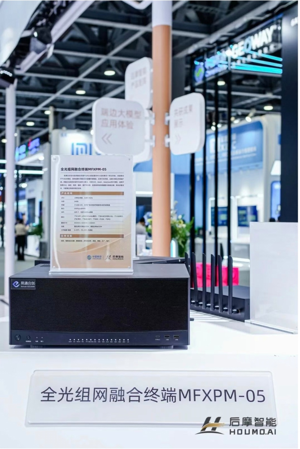 本次展会的重要亮点之一,是后摩智能与中国移动共同推出的三款”FTTO+X”全光组网超融合终端:MFXL2-04、MFXP-05、MFXPM-05,这也是后摩智能与中国移动合作的阶段性成果。早在2024年3月,后摩智能就已经与中国移动展开深度的技术合作,MWC2024大会上,双方已实现6B参数大模型的端边实时运行,创下存算一体芯片支持大模型端到端运行的行业首次。